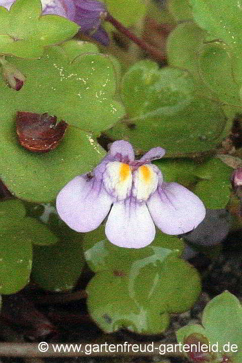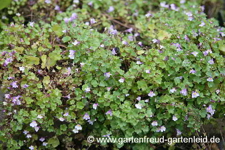 Ganz entfernt erinnert Cymbalaria muralis vom Wuchs und den Blättern her an den Gundermann (Glechoma), allerdings macht sie sich nicht wie er im Beet und im Rasen breit. Solche Standorte sind nichts für das Zimbelkraut. Das braucht Halbschatten bis Schatten und Steine – Mauern, Felsspalten, Gesteinsbruch, Schotterflächen, Steinfugen und Ähnliches –, dann geht es ihm gut. So gut, dass es mit seinen Ausläufern große Bestände bildet und sich zudem über Aussaat ausbreitet. Seine Vermehrung nimmt es damit gern selbst in die Hand. Wer Cymbalaria gern noch an weiteren Plätzen ansiedeln möchte, kann sie problemlos mittels Teilung vermehren (im Frühling ist es am besten), so sie denn nicht in allzu engen Ritzen siedelt.