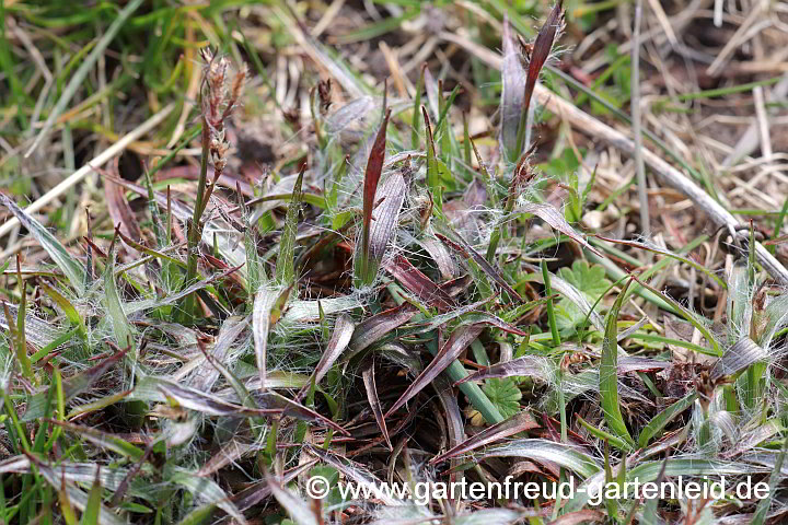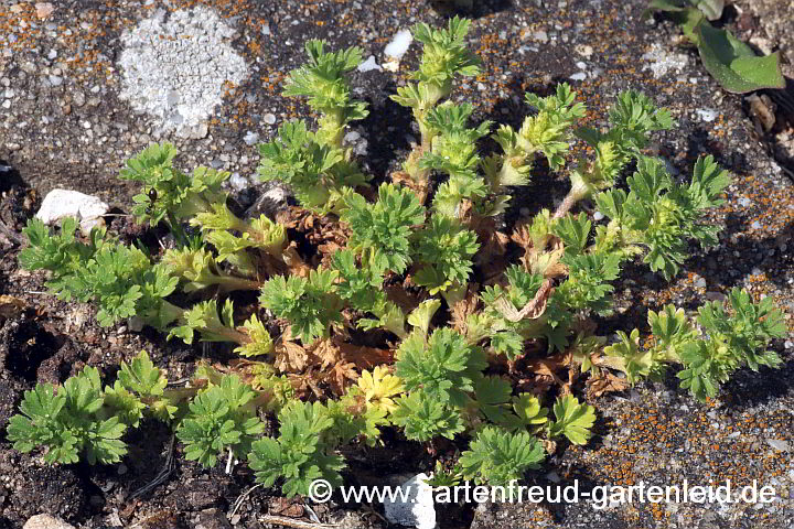 Am besten arbeiten Sie beim Entfernen der Mutterpflanzen und ihrer Sprösslinge mit einem Handschäufelchen oder Unkrautstecher. Die ausgegrabenen Pflanzen können Sie auf dem Kompost entsorgen (unbedingt etwas eingraben!), allerdings mit einer kleinen Einschränkung: Die Pflänzchen dürfen noch nicht blühen, erst recht natürlich noch keinen Samen angesetzt haben.