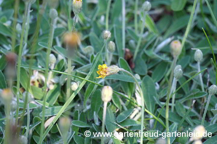Das schaffen dafür diejenigen unter diesen Unkräutern, die nur kurze Ausläufer machen. Die Kleine oder Gewöhnliche Braunelle (Prunella vulgaris) und das Knäuel-Hornkraut (Cerastium glomertum) sind beispielsweise solche Kandidaten, die zu hübschen Polstern heranwachsen, wenn man sie lässt. Der Kriechende Weißklee (Trifolium repens) sowie die Habichtskräuter (Pilosella spec., früher Hieracium) spielen noch mal in einer anderen Liga, sie bilden regelrechte Rasen.